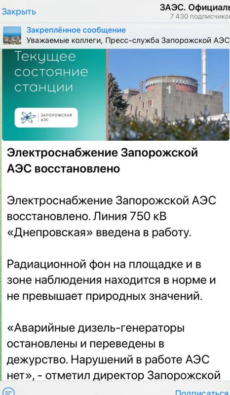 Минувшей ночью на Запорожской АЭС произошло отключение обеих внешних линий электропередачи, что привело к временной полной потере внешнего энергоснабжения. В соответствии с процедурами, автоматически были запущены резервные дизель-генераторы для...