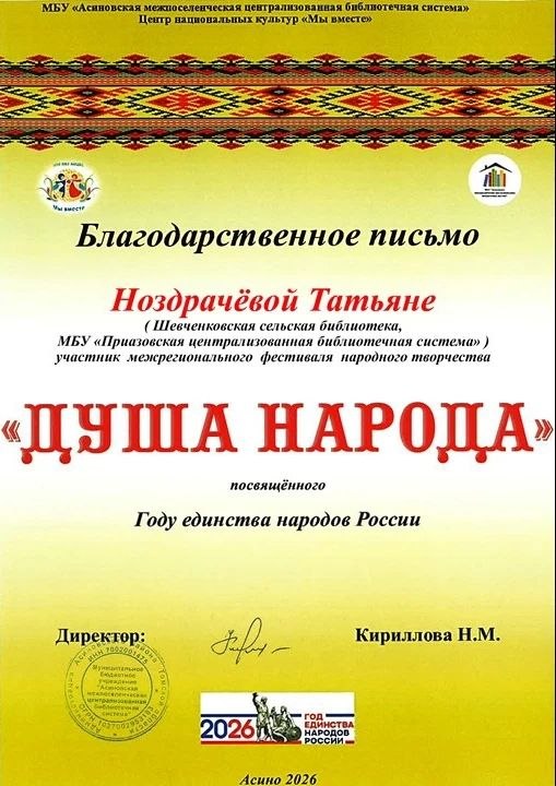 Библиотекарь, Шевченковской сельской библиотеки, обособленное подразделение МБУ "ПЦБС" Ноздрачева Татьяна Петровна, приняла участие в онлайн-фестивале "ДУША НАРОДА", посвященного Году единства народов России.
