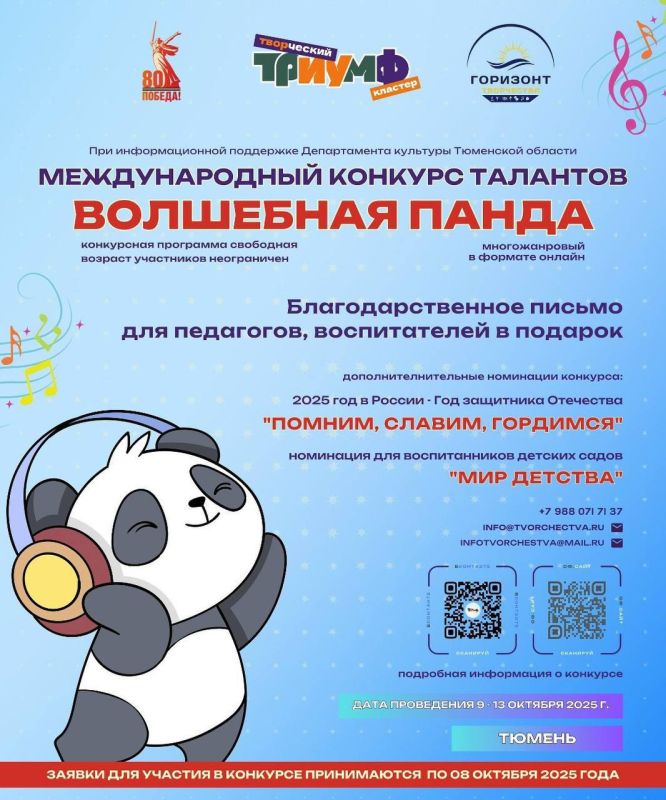 Международный конкурс талантов«Волшебная Панда»Конкурс проводится с 9 по 13 октября, проходит в онлайн формате, многожанровый, возраст участников неограничен.Заявки принимаются по 8 октября 2025 года на официальном сайте.Онлайн конкурсы под эгидой...