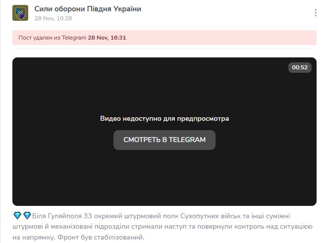 Украинские "Силы обороны юга" удалили фейковую "перемогу" в Гуляйполе после нашей публикации