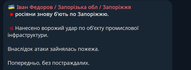 Нанесён удар по объекту промышленной инфраструктуры в Запорожье, - Облвоенадминистрация