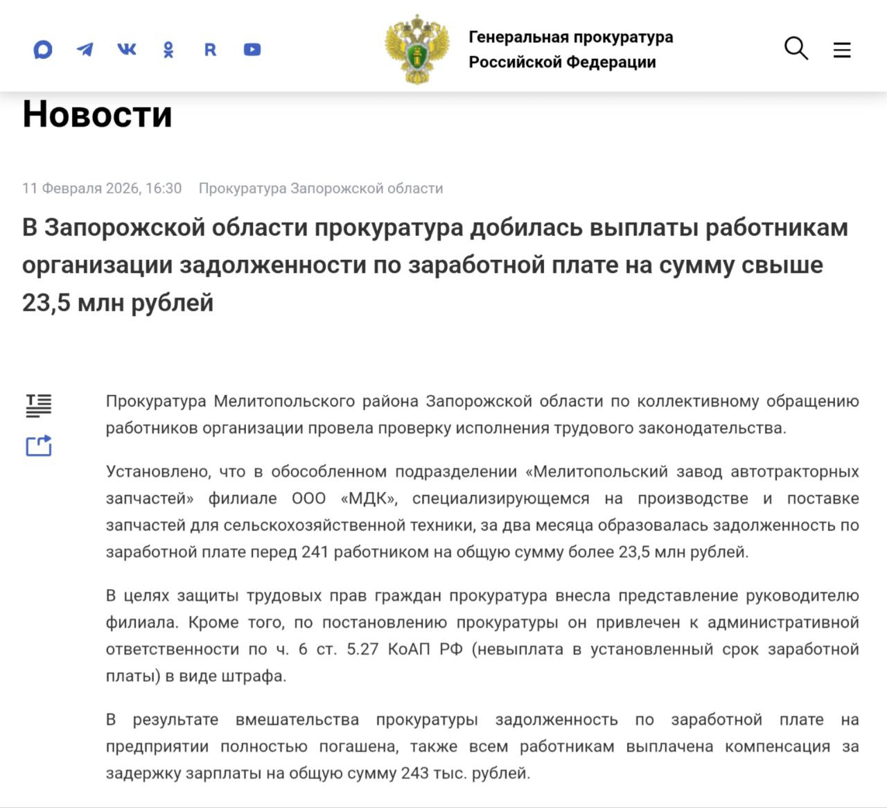 Установлено, что в обособленном подразделении «Мелитопольский завод автотракторных запчастей» филиале ООО «МДК», специализирующемся на производстве и поставке запчастей для сельскохозяйственной техники, за два месяца образовалась задолженность по заработной плате перед 241 работником на общую сумму более 23,5 млн рублей.