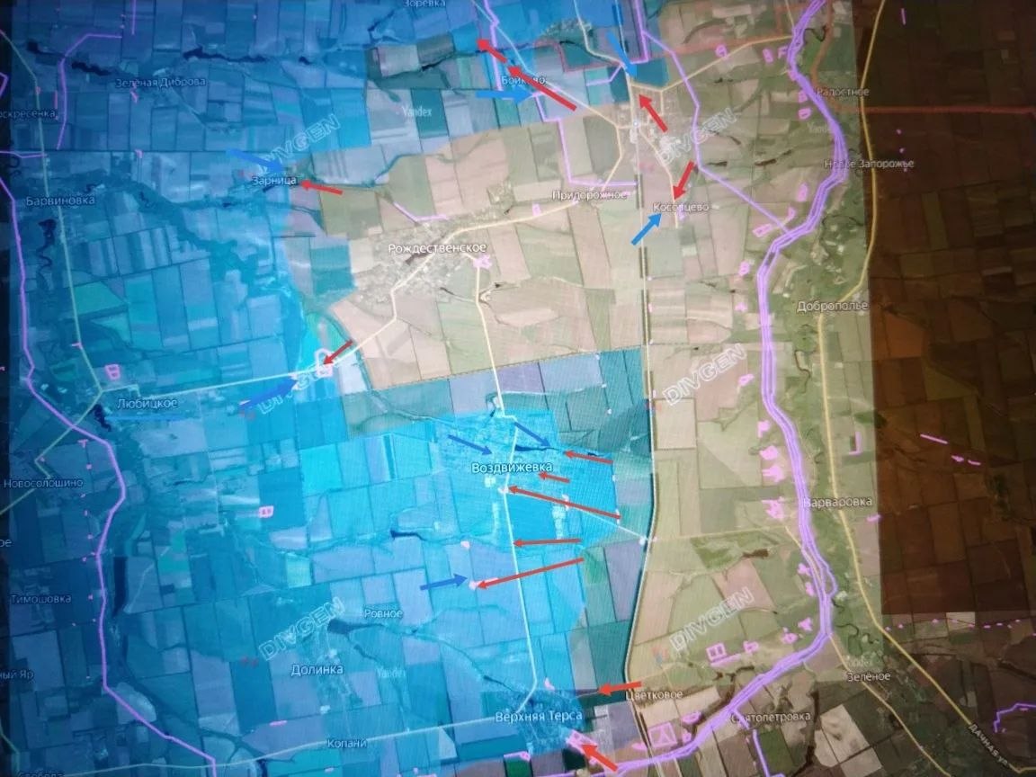 Севернее, из района Бойково - Рождественское - Терноватое наши подразделения продолжают атаковать в направлении Любицкого, Зарницы и Зоревки.