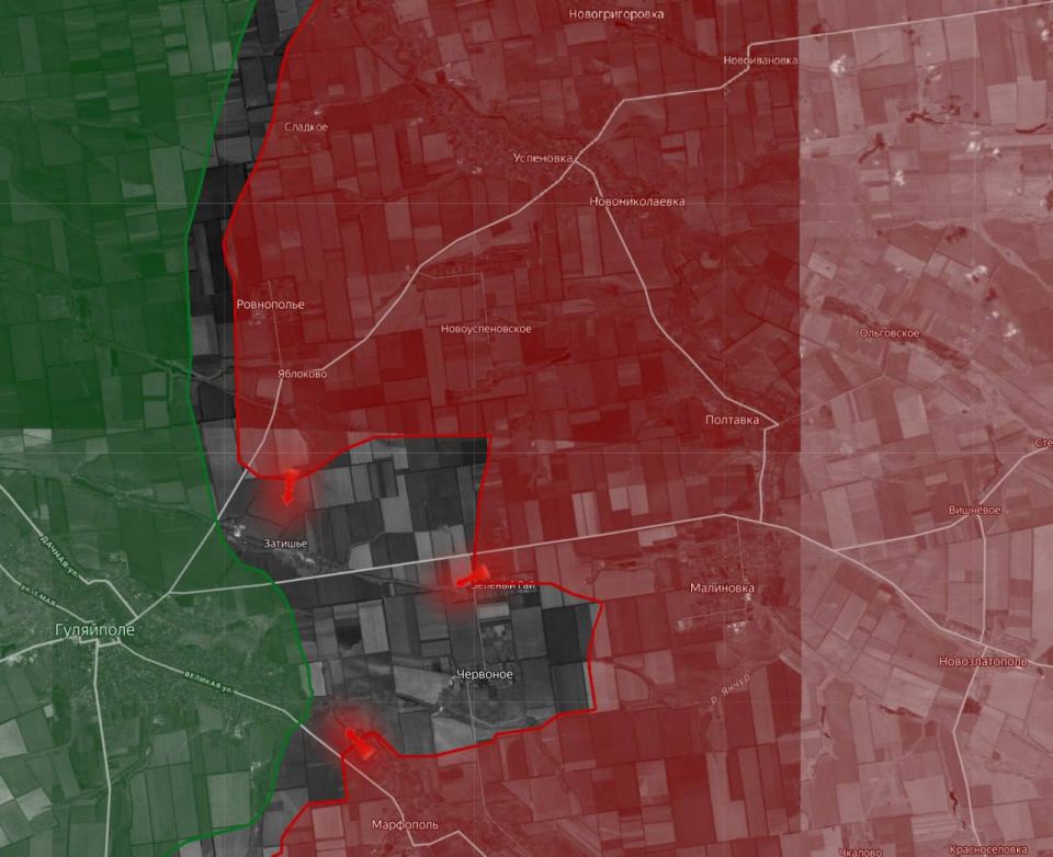 «На Днепропетровском направлении российские войска оттеснили ВСУ из поселка Зеленый Гай – ВСУ отходят к восточным окраинам Гуляйполя.При этом дороги в районе города активно атакуются российскими FPV-дронами».Вражеские сводки