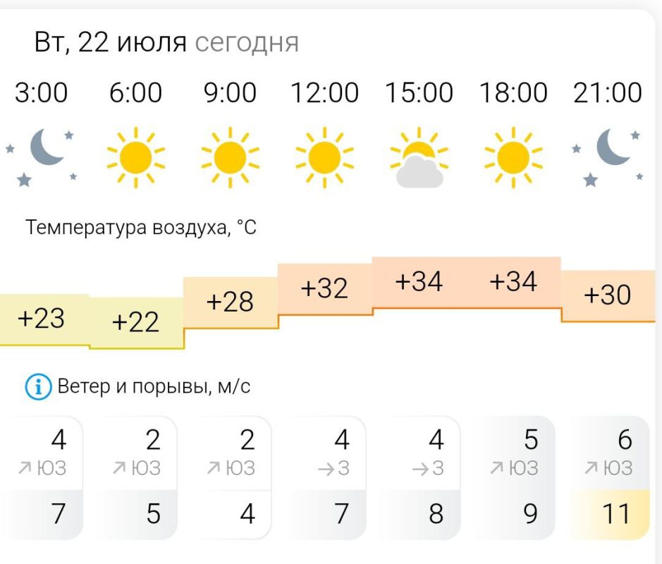 Температура воздуха ночью +22°C, днём +34°C, ветер западный, юго-западный, порывы ветра до 11 м/с.