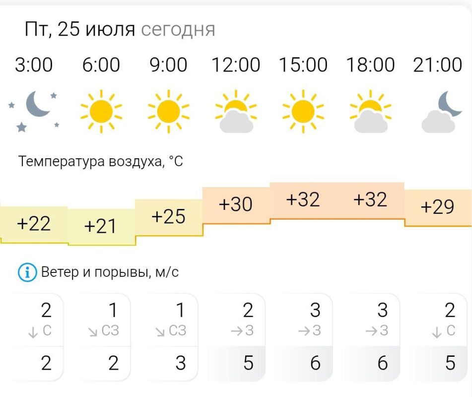 Температура воздуха ночью +21°C, днём +32°C, ветер западный, северный, северо-западный, 1-3 м/с.