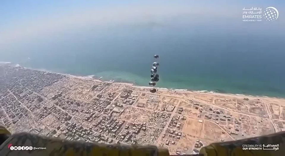 ВВС ОАЭ провели первый сброс гуманитарной помощи жителям сектора Газа с военно-транспортного самолёта C-130.