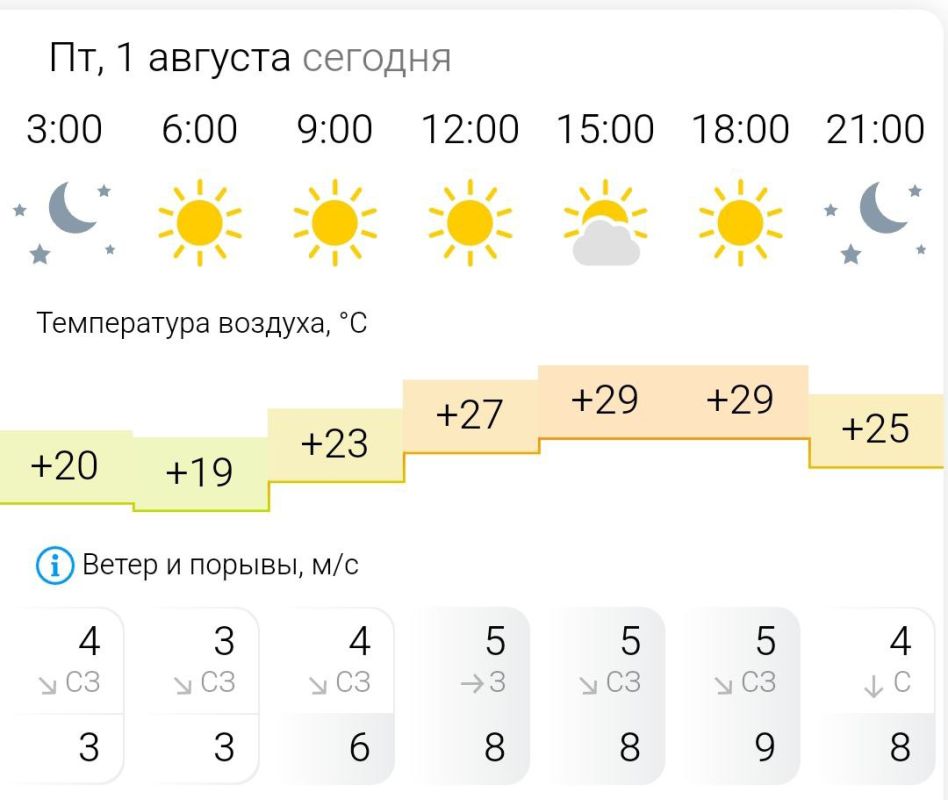 Температура воздуха ночью +19°C, днём +29°C, ветер северо-западный, западный, северный, 3-5 м/с.