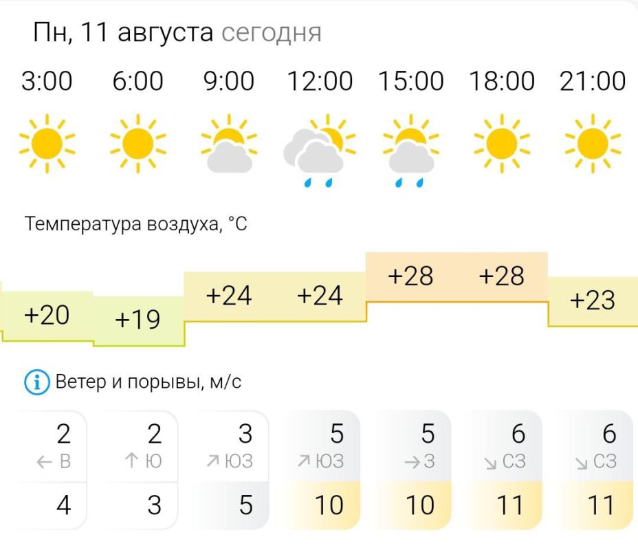 Температура воздуха ночью +19°C, днём +28°C, ветер переменный, порывы ветра до 10-11 м/с.