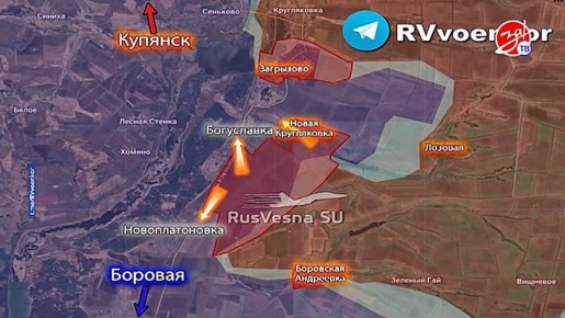 На юге купянского направления армия России наступает к Боровой. Идёт штурм Богуславки, передовые отряды пробиваются к Новоплатоновке. В целом, восточный берег Оскольского водохранилища потерял значимость для ВСУ после потери Купянска. Значительные подкрепления в этот район ВСУ перебрасывать не будут. Для российской армии этот район должен стать плацдармом для наступления на Славянск.