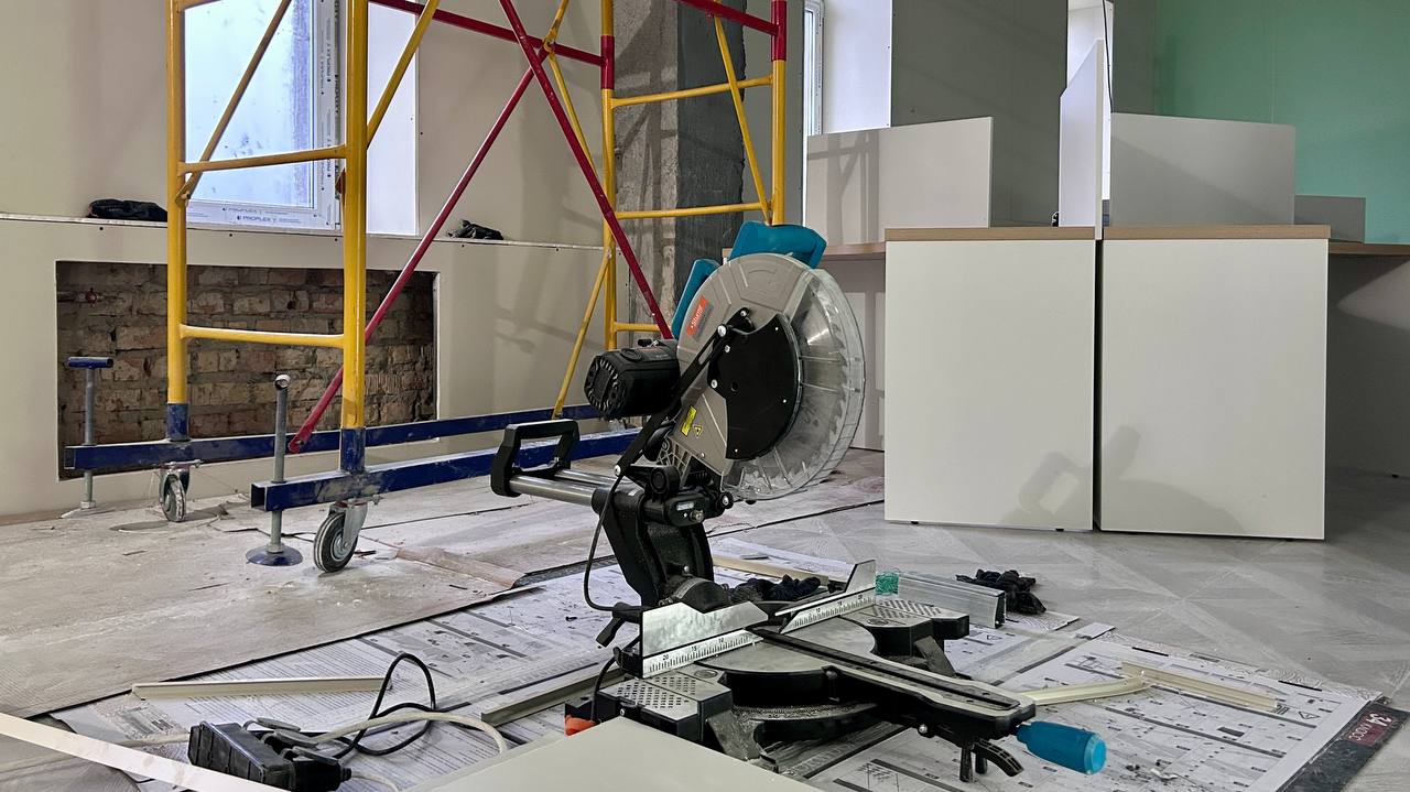 На объекте идут финальные ремонтные работы. Уже завершен основной этап: установлены окна, покрашен потолок, обшиты стены и уложено напольное покрытие.
