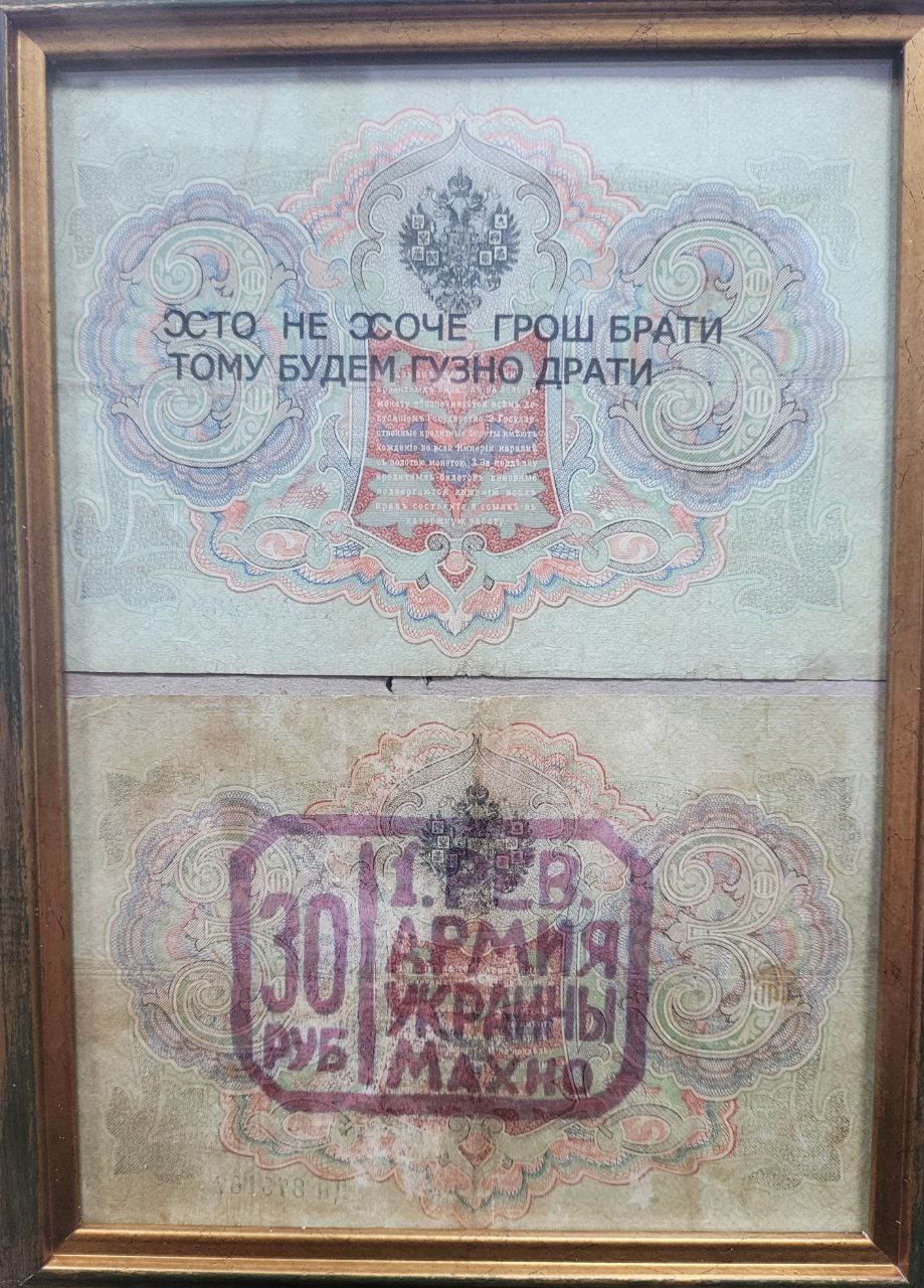 Напечатал эту купюру в 30 рублей банк Нестора Махно. Надпись на ней — веселая анархистская. Во были времена!