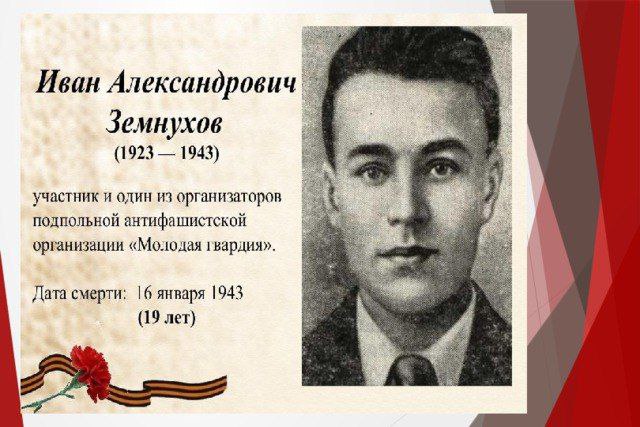 В занятом фашистами Краснодоне Иван Земнухов активно включился в подпольную работу, став участником подпольной комсомольской организации "Молодая гвардия". Земнухова избирают членом штаба. Вместе с Олегом Кошевым, Иваном Туркеничем и другими членами штаба он разрабатывает планы боевых операций, составляет тексты листовок, готовит клятву для вступающих в "Молодую гвардию". Важная роль принадлежит ему в создании подпольной типографии, в печатании первых листовок, в их распространении. Он принимал участие в боевых операциях.