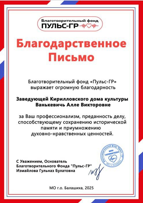 духовно-нравственных ценностей, руководитель Кирилловского Дома культуры Алла Викторовна Ванькевич и дружный коллектив Кирилловского Дома культуры отмечены Благодарственными письмами от Гульназ Булатовны Измайловой, основателя Благотворительного фонда "Пульс-ГР".