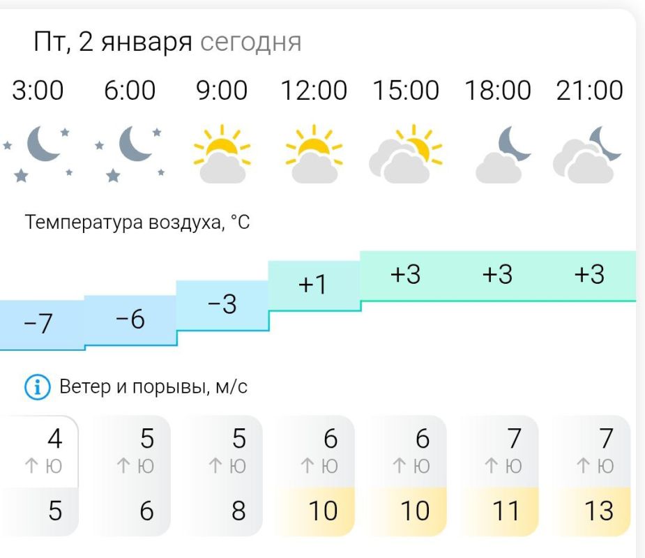 Температура воздуха ночью -7°C, днём +3°C, ветер южный, порывы ветра до 10-13 м/с.