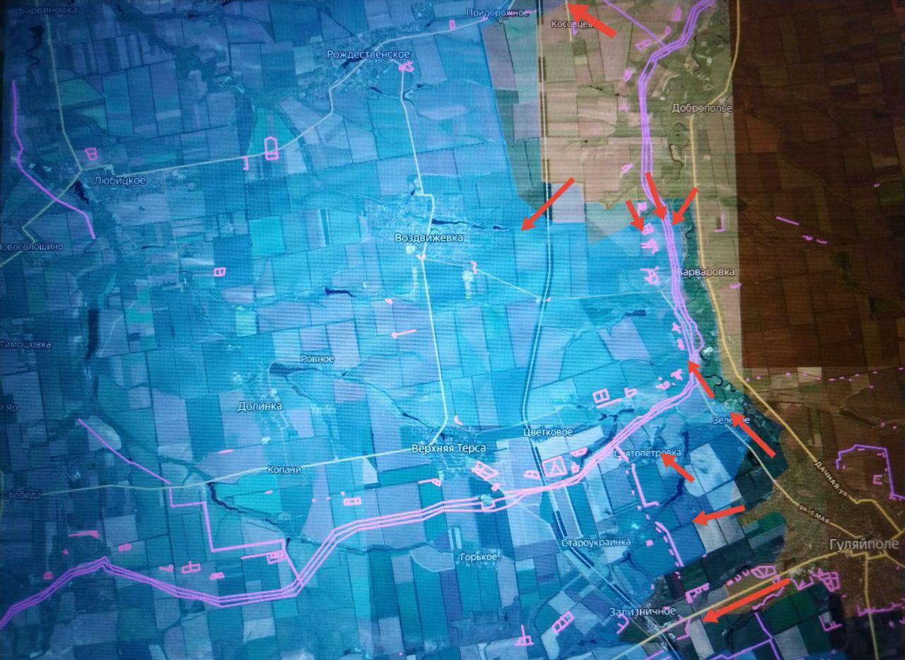 Продолжаются ожесточённые бои западнее Гуляйполя, где противник постоянно контратакует силами штурмовых бригад, и в районе плацдармов на левом берегу р. Гайчур;