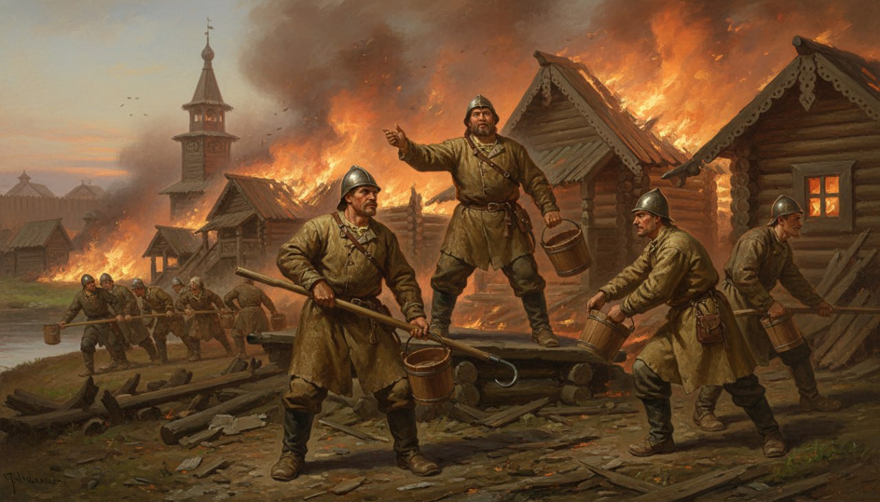 Представь Древнюю Русь, города сплошь деревянные, малейшая искорка и на месте гордого града оставалось лишь пепелище. Горело всё — от Новгорода до Москвы. Люди были почти бессильны, так как не было ни команд, ни организации. Всё изменилось с XV века. После очередного опустошительного пожара Иван III издал первые «противопожарные» указы , по ним горожанам запрещалось летом топить бани, а на улицах поставили «рогатки» — заставы с ночными дежурными, чтобы сдержать воров и поджигателей .