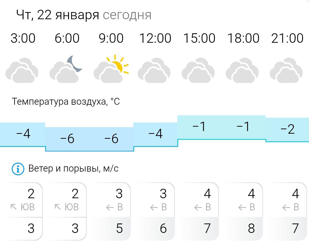 Температура воздуха ночью -6°C, днём -1°C, ветер юго-восточный, восточный, 2-4 м/с.