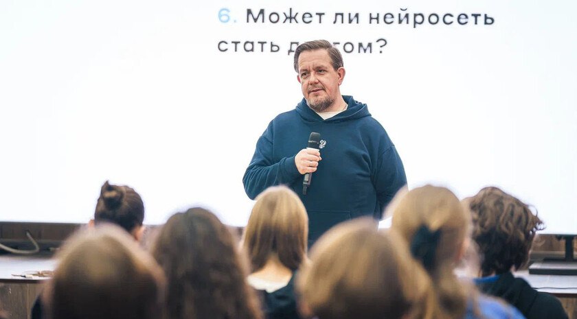 Лектор Российского общества «Знание» Александр Асафов рассказал ребятам о проблеме чрезмерного доверия к нейросетям, негативном влиянии ИИ-технологий на когнитивное состояние человека и методы борьбы с ними.