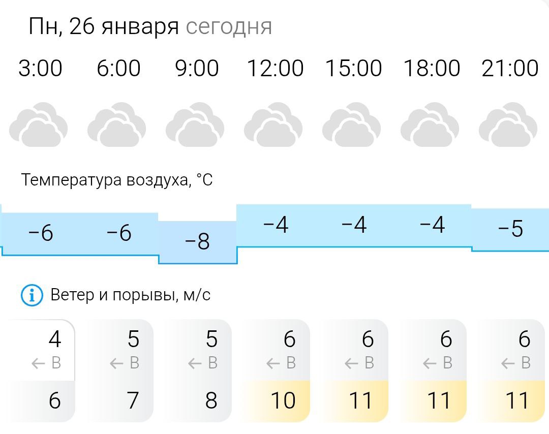Температура воздуха ночью -6°C, днём -4°C, ветер восточный, порывы ветра до 10-11 м/с.