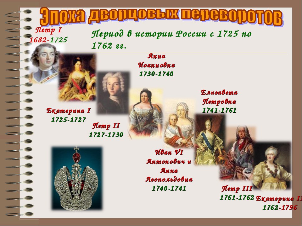 Эпоха дворцовых переворотов принятое в исторической литературе название периода в политической истории России, когда в результате борьбы придворных группировок при поддержке гвардии неоднократно происходила насильственная смена правителя или его ближайшего окружения. Термин был введен Ключевским и закрепился за периодом 17251762 гг.За 37 лет на российском престоле сменилось шесть императоров. Дворцовыми переворотами сопровождалось восшествие на престол Екатерины I (1725), Анны Иоанновны (1730), Елизаветы Петровны (1741), Екатерины II (1762).