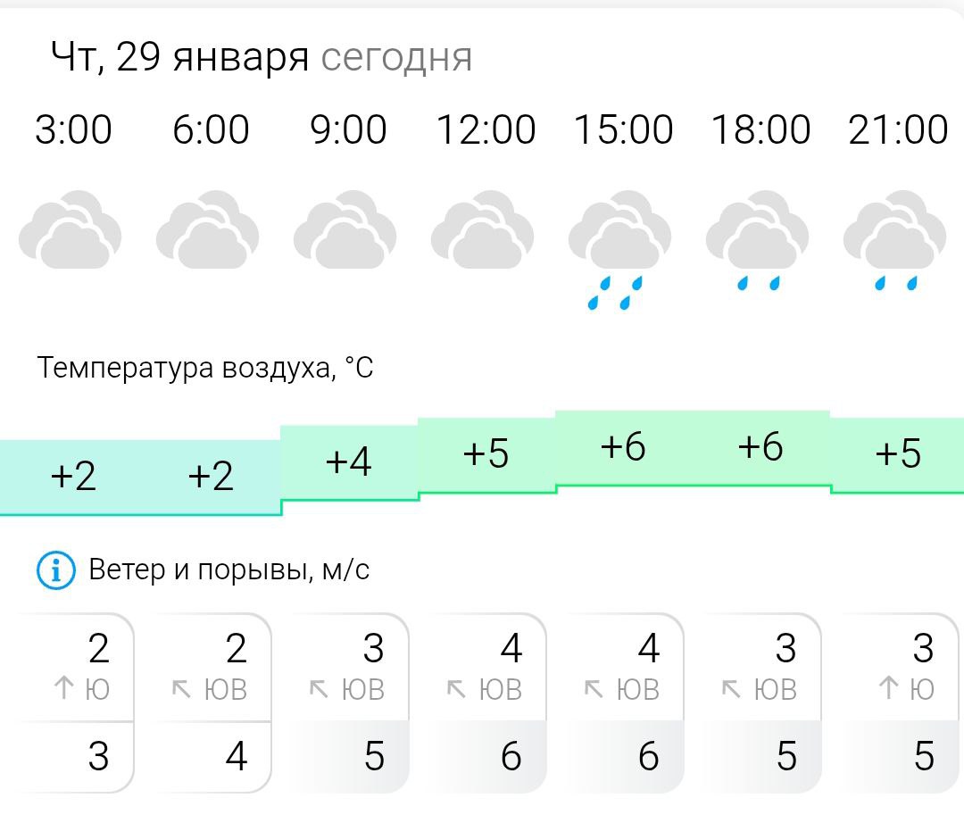 Температура воздуха ночью +2°C, днём +6°C, ветер южный, юго-восточный, 2-4 м/с.