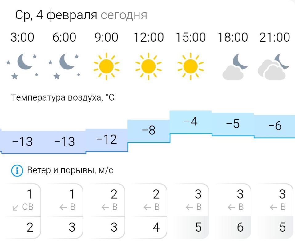Температура воздуха ночью -13°C, днём -4°C, ветер северо-восточный, восточный, 1-3 м/с.