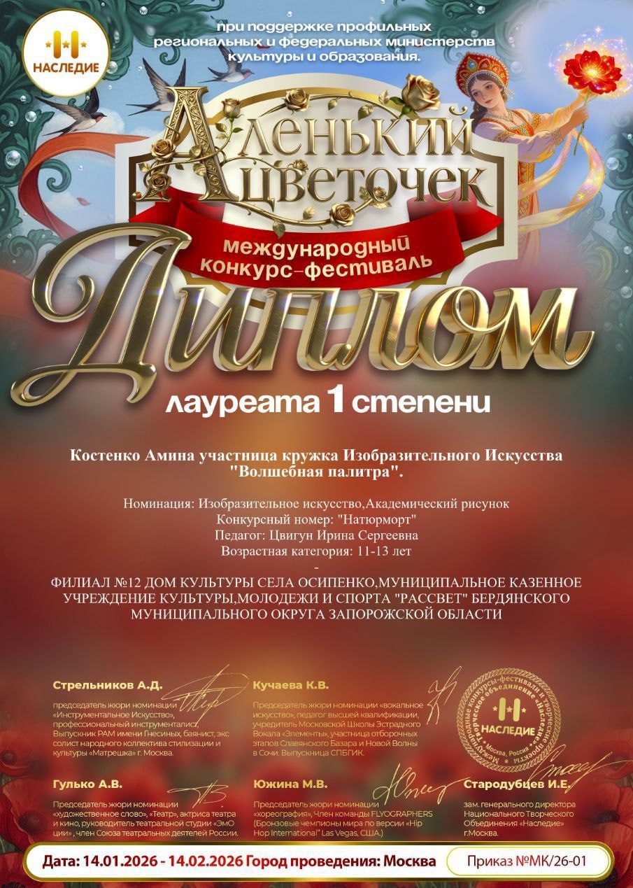 Воспитанница кружка «Волшебная палитра» филиала № 12 ДК с. Осипенко — Амина Костенко — блестяще выступила на престижных международных и национальных конкурсах.