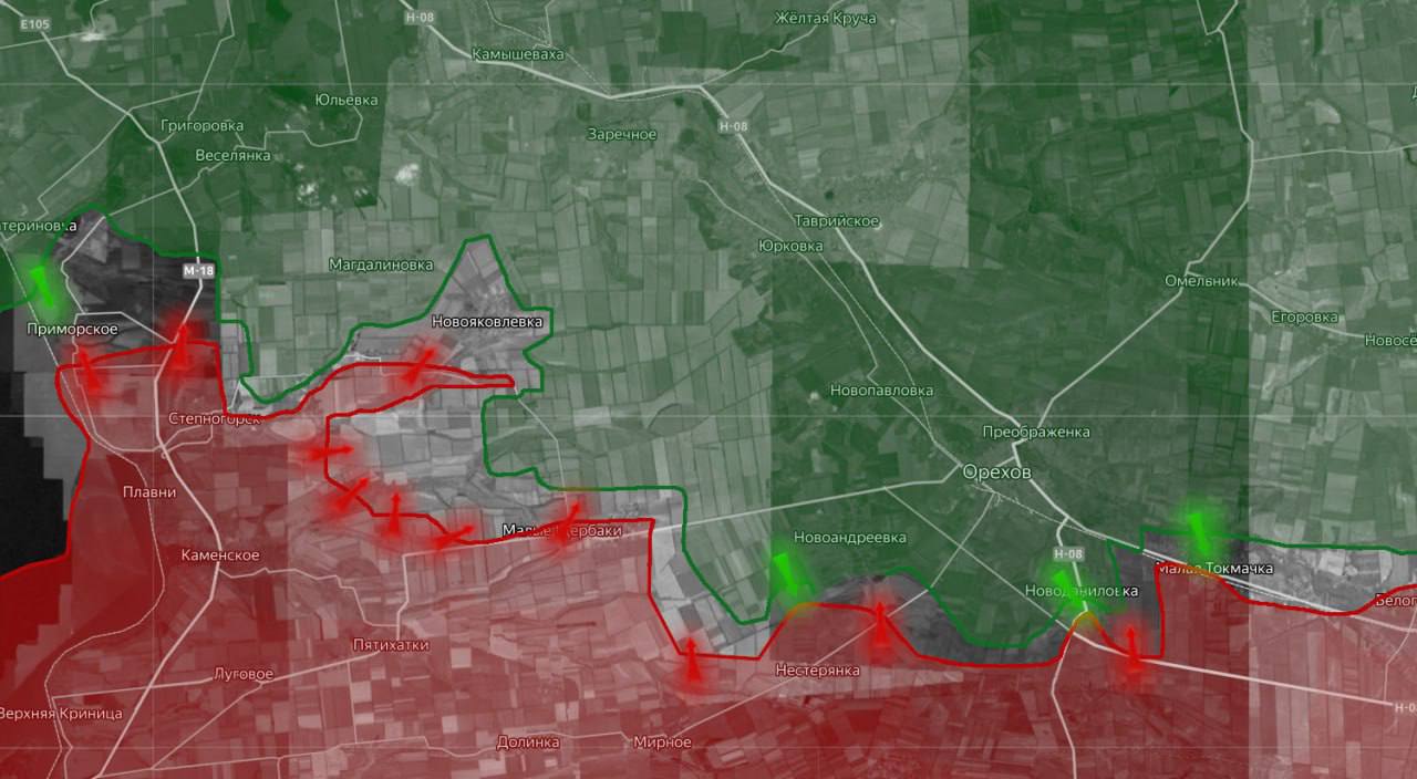 «На Запорожском направлении продолжаются боестолкновения в Приморском и Речном.Идут бои за Лукьяновское и севернее Степногорска.Российские войска атакуют артиллерией и дронами позиции ВСУ в Малокатериновке».Вражеские сводки