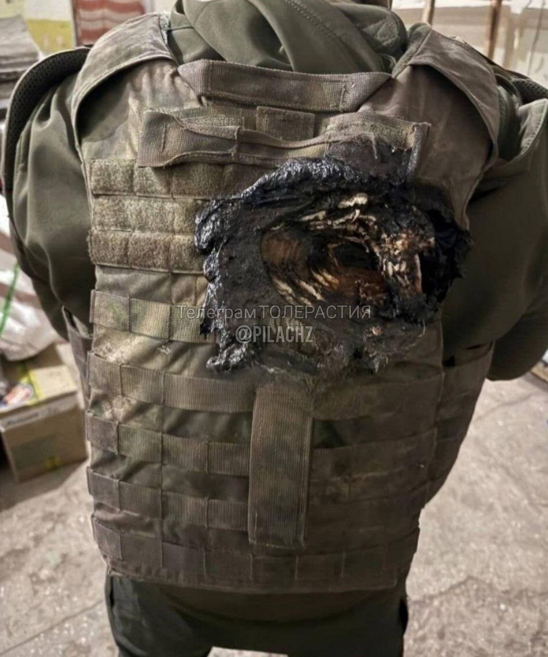 Не пренебрегайте боонезащитой. Броник нашего бойца. Снаряд взорвался в паре десятков сантиметров, спасла бронепластина.