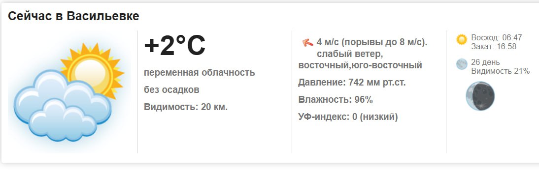 Сегодня, 13 февраля 2026 года в Васильевке ожидается переменная облачность, без осадков. Температура воздуха ... +2°С. Ветер: восточный, юго-восточный до 8 м/с. Атмосферное давление: 742 мм.рт.ст. Влажность воздуха: 96%. УФ-индекс: 0 (низкий). Видимость на дорогах: 20 км.