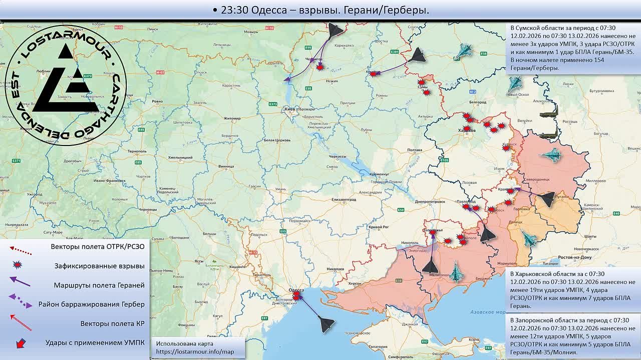 Анимированная схема ударов по территории Украины 12 февраля 2026 – 13 февраля 2026 года