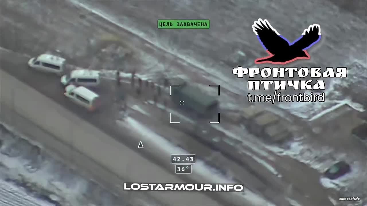 Наш молниеносный барражирующий боеприпас "Ланцет" наносит удар по грузовому автомобилю и скоплению пехоты ВСУ.