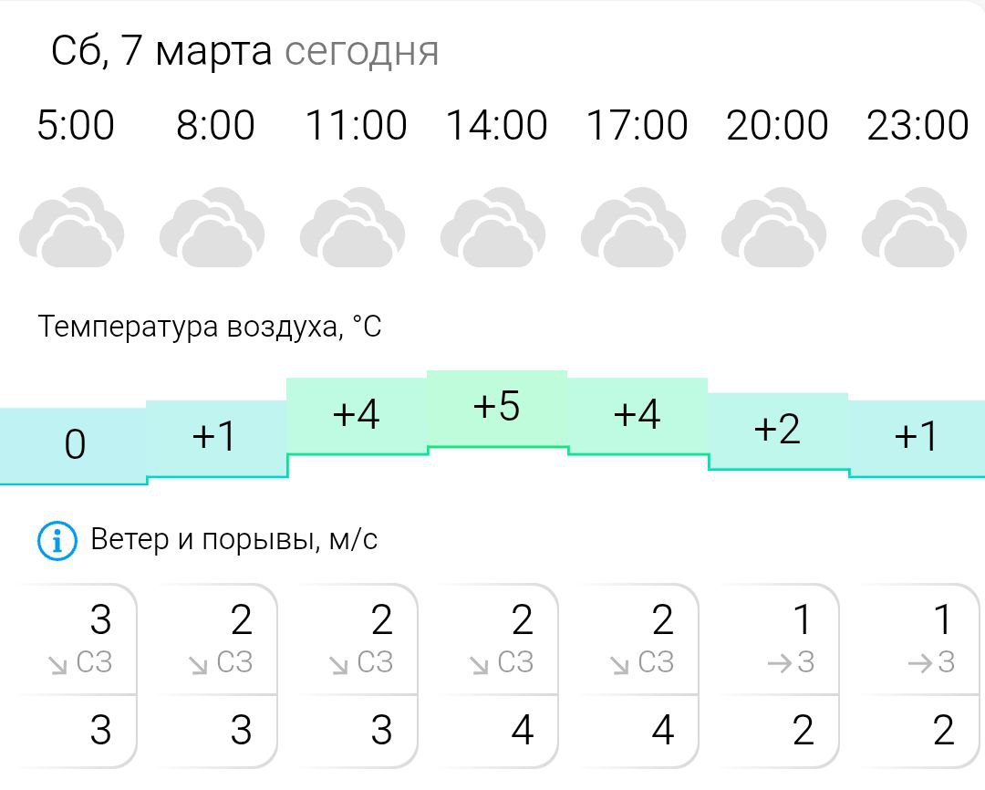 Температура воздуха ночью 0°C, днём +5°C, ветер северо-западный, западный, 1-3 м/с.