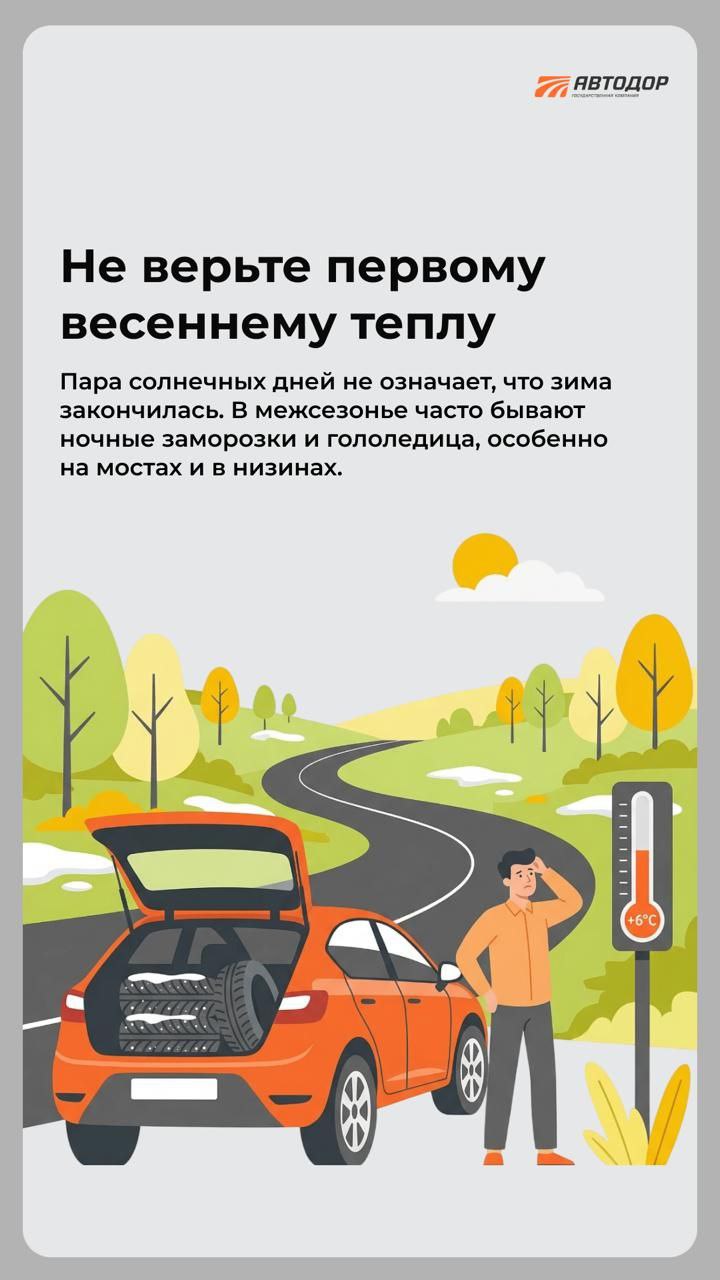Весна уже чувствуется, но спешить с заменой шин не стоит. Межсезонье – период, когда погода может резко меняться. Днем тепло, а ночью возможны заморозки и гололедица.
