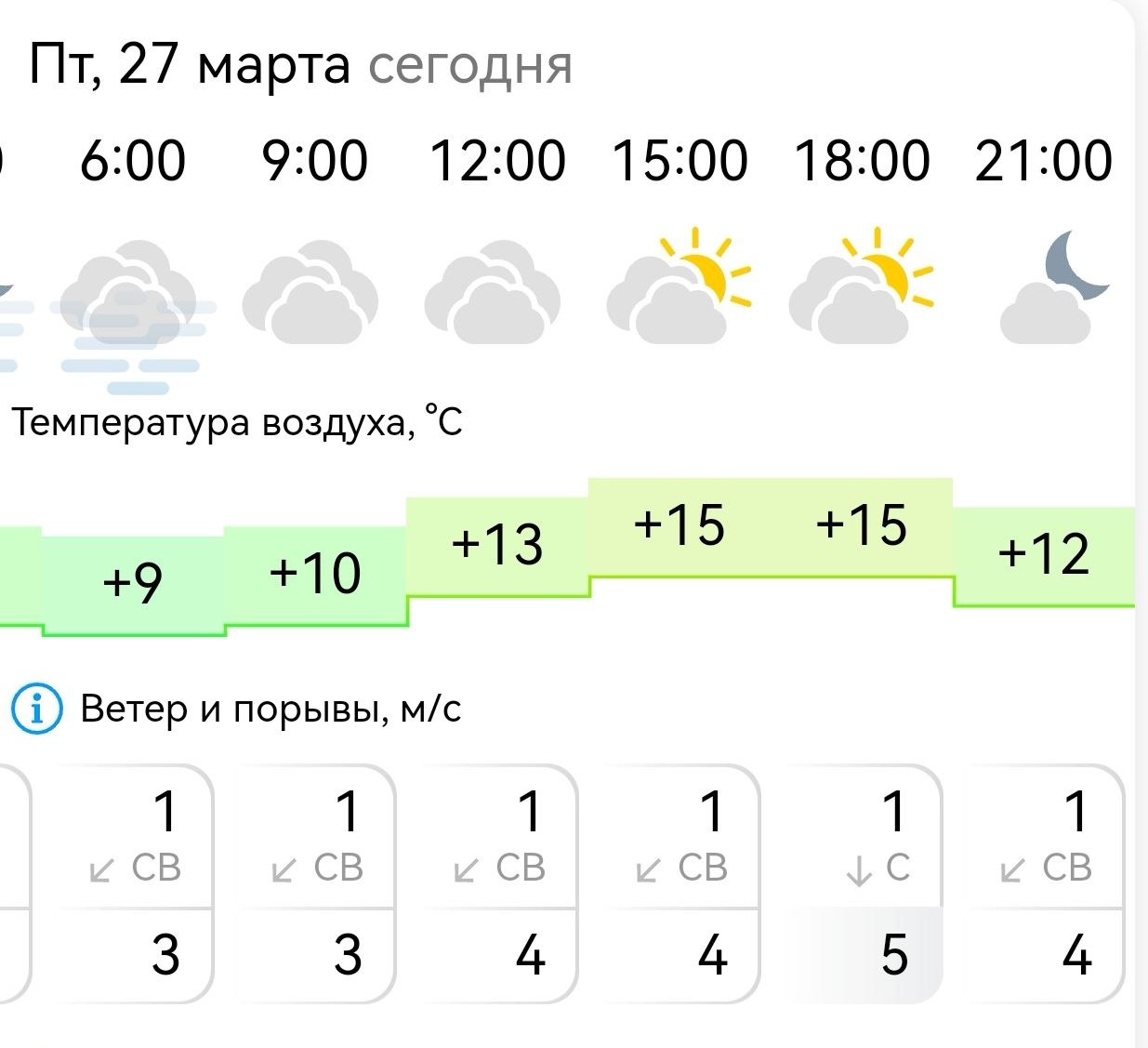 Температура воздуха ночью +9°C, днём +15°C, ветер северо-восточный, северный, 1 м/с.