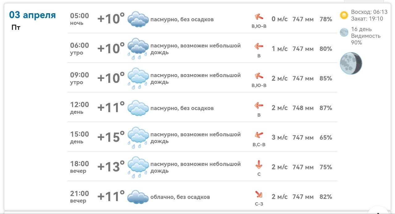 Сегодня пятница, 3 апреля, погода будет пасмурной. Утром столбики термометров покажут +10°, днём воздух прогреется до +15°, а к вечеру опустится до +11°.