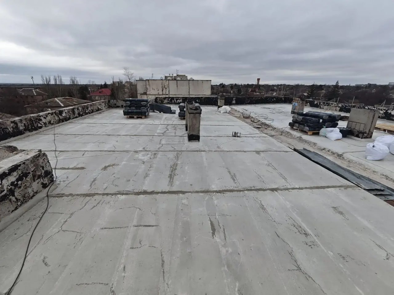 На крыше МКД по улице Восточной в Пологах строители залили бетонную «подушку»
