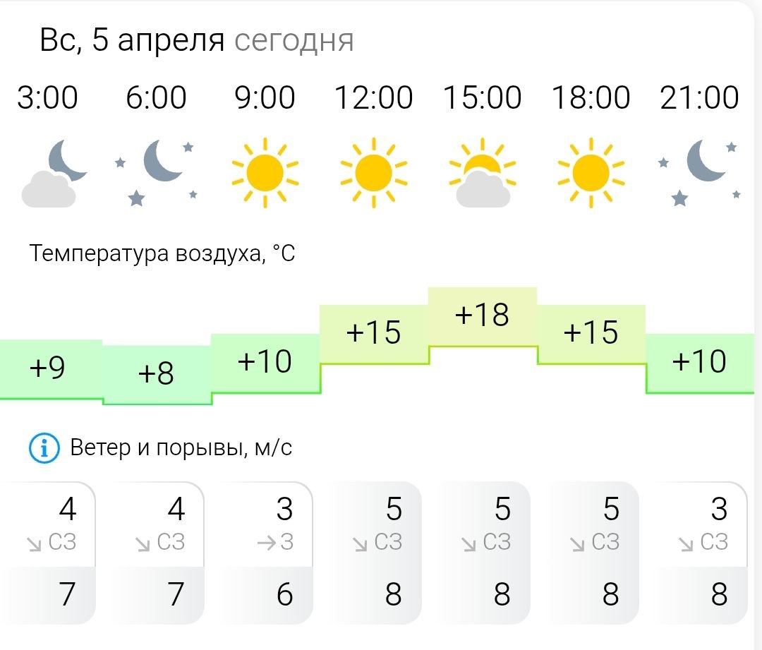 Температура воздуха ночью +8°C, днём +18°C, ветер западный, северо-западный, 3-5 м/с.