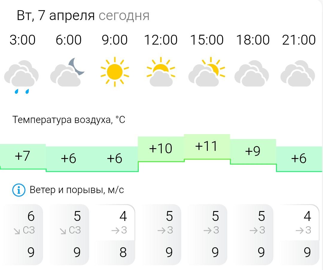 Температура воздуха ночью +6°C, днём +11°C, ветер западный, северо-западный, 4-6 м/с.