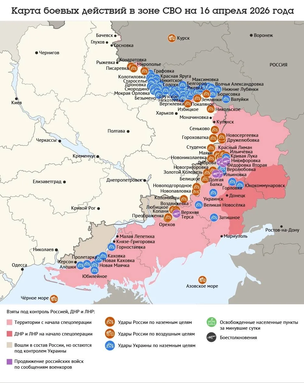 Карта боевых действий в зоне СВО на 16 апреля 2026 года