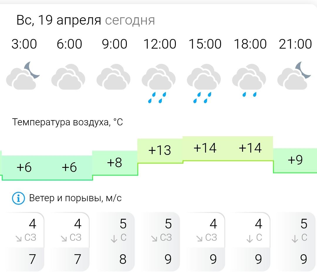 Температура воздуха ночью +6°C, днём +14°C, ветер северный, северо-восточный, 4-5 м/с.