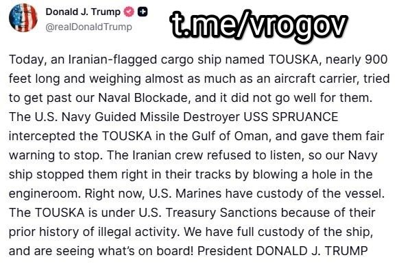 "Сегодня иранский грузовой корабль TOUSKA длиной почти 900 футов и весом почти как авианосец пытался прорваться через нашу военно-морскую блокаду, и для них это закончилось неудачно.