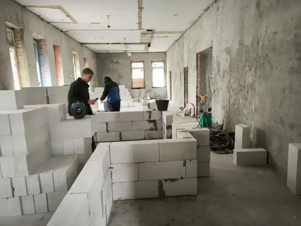 Подрядчик уже выровнял стены — это была основа для дальнейших работ. Сделана точная разметка под новые помещения. Началось возведение межкомнатных перегородок из блоков — своими глазами видно, как меняется внутренняя планировка.