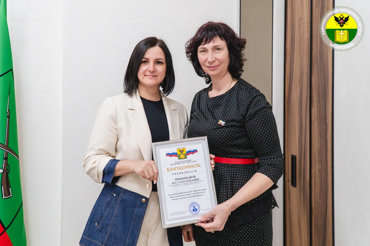 Исполняющая обязанности председателя Мелитопольского городского Совета депутатов Ирина Владиславовна Матвиенко вручила работникам благодарности за профессионализм при решении повседневных задач жителей, добросовестный труд и активную гражданскую позицию, направленную на развитие округа.