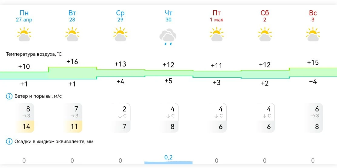 Самым тёплым днём будет вторник (+16°С). Хорошей недели!