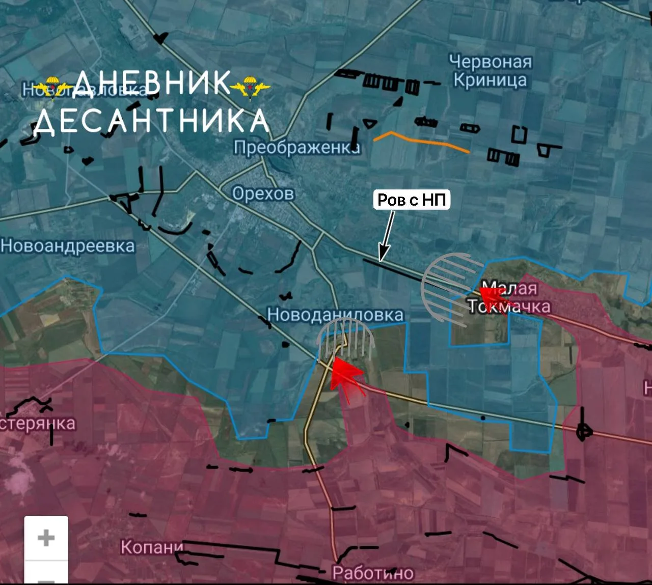 В западной части Малой Токмачки продолжаются бои. Практически вся территория от центра и до Орехова в серой зоне, закрепиться негде, здания разрушены, враги держат контроль только по воздуху, живую силу в штурмы почти не отправляют, но и большое количество вражеских БПЛА не дают нам продвинуться. Помимо этого, вдоль дороги на Орехов у противника длинный укреплённый ров, в котором есть НП.