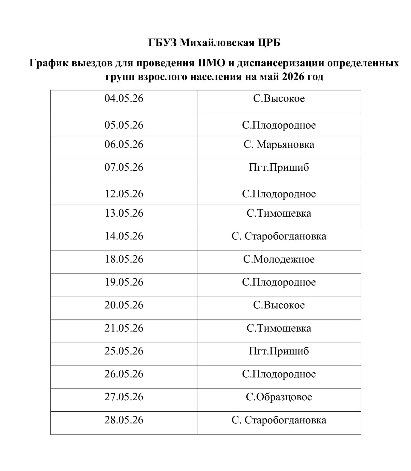График ПМО и диспансеризации взрослого населения на май 2026 год