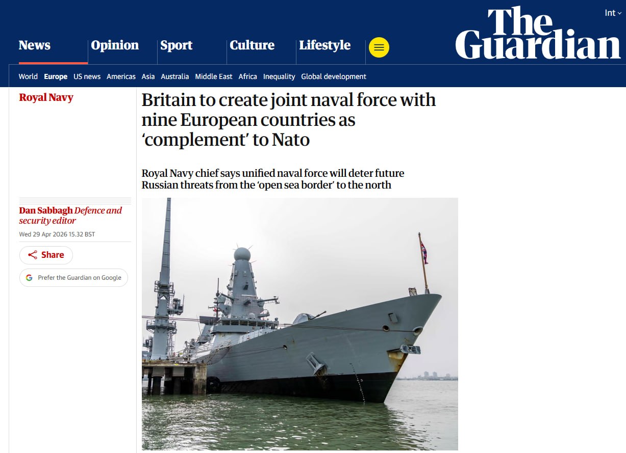 Издание The Guardian выпустило статью, в которой цитируются слова главы военно-морских сил Великобритании. Он заявил, что 10 европейских стран собираются объединить свои флоты для сдерживания России: