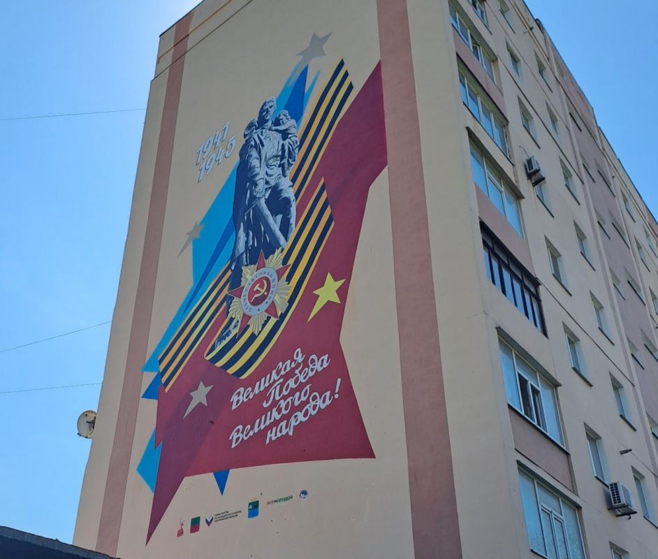 К юбилею Победы в Бердянске на доме № 166 по ул. Пионерская появился тематический мурал. Он был создан за неделю опытными крымскими художниками.